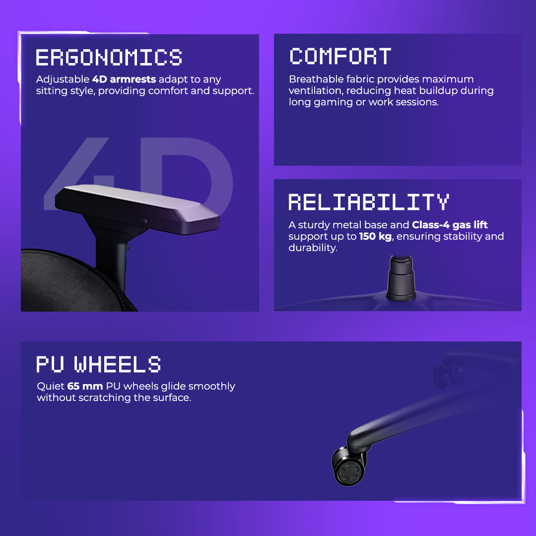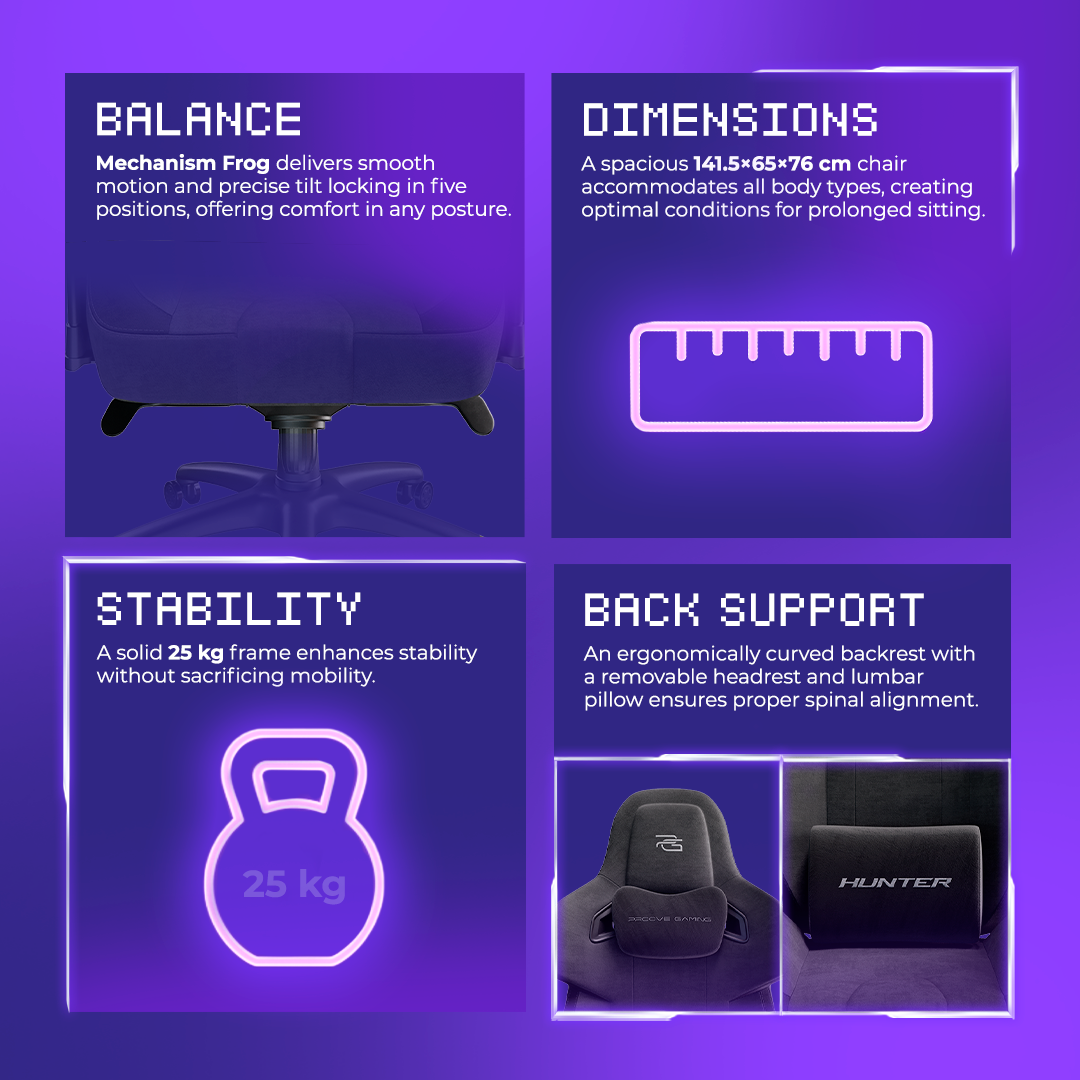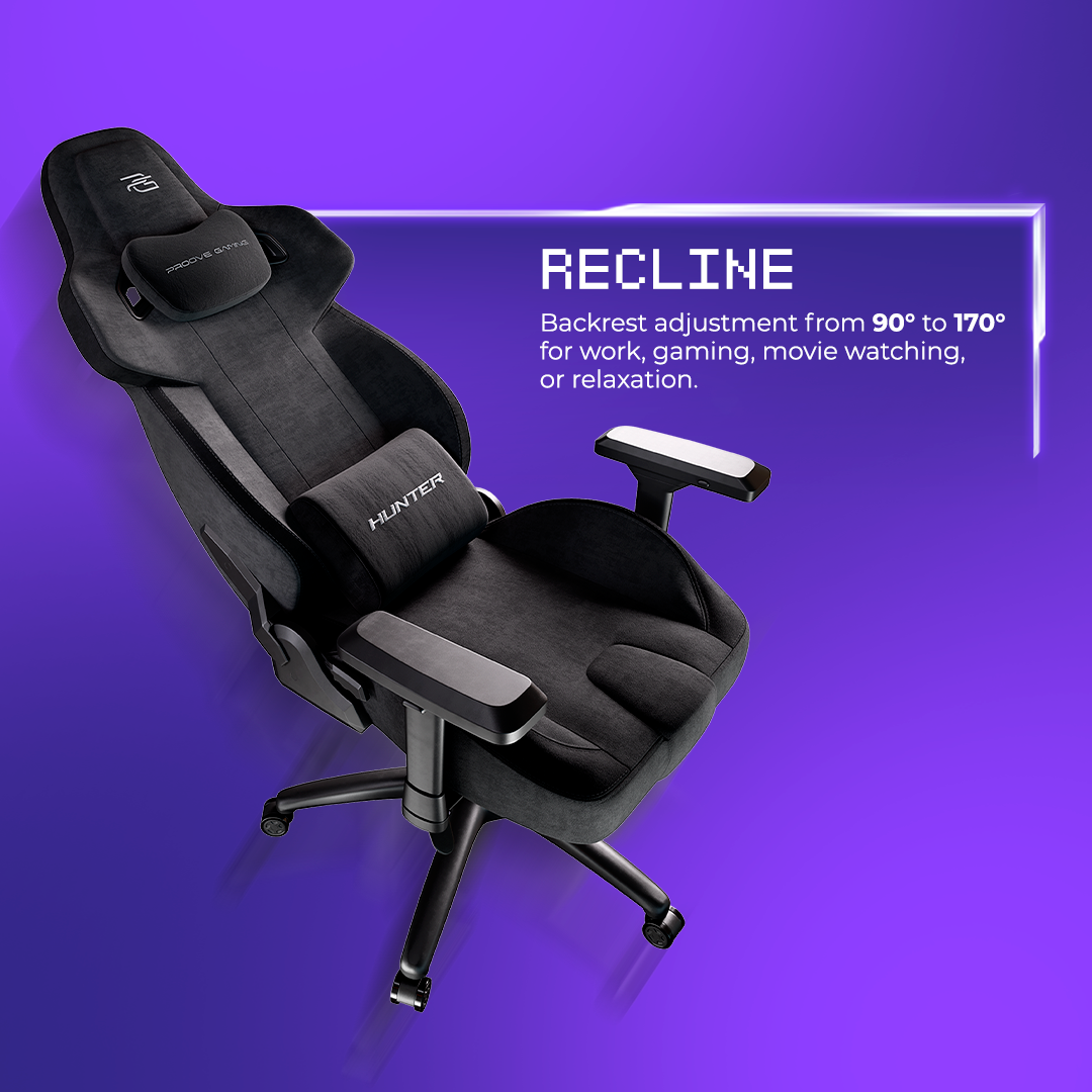 The Proove Gaming Hunter captivates with its clean, minimalist lines and practical design. The prominent side support not only adds a touch of sophistication but also ensures a secure and comfortable fit for every gamer.