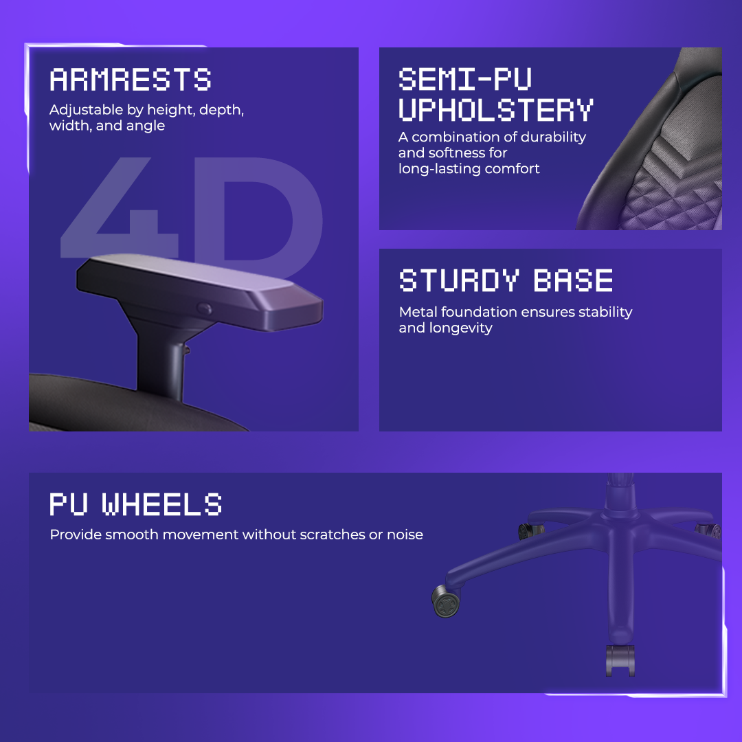 Крісло збегірає стійкість навіть під час розгойдування, а завдяки механизму frog сидіння можна нахилити максимум на 17°. Комфортну посадку гарантує надійна бічна підтримка та 4D-підлокітники, що можна відрегулювати у кількох напрямках. А якщо хочется відпочити, спинку можна відкинути на 170॰, що є вражаючим показником для геймерського крісла.