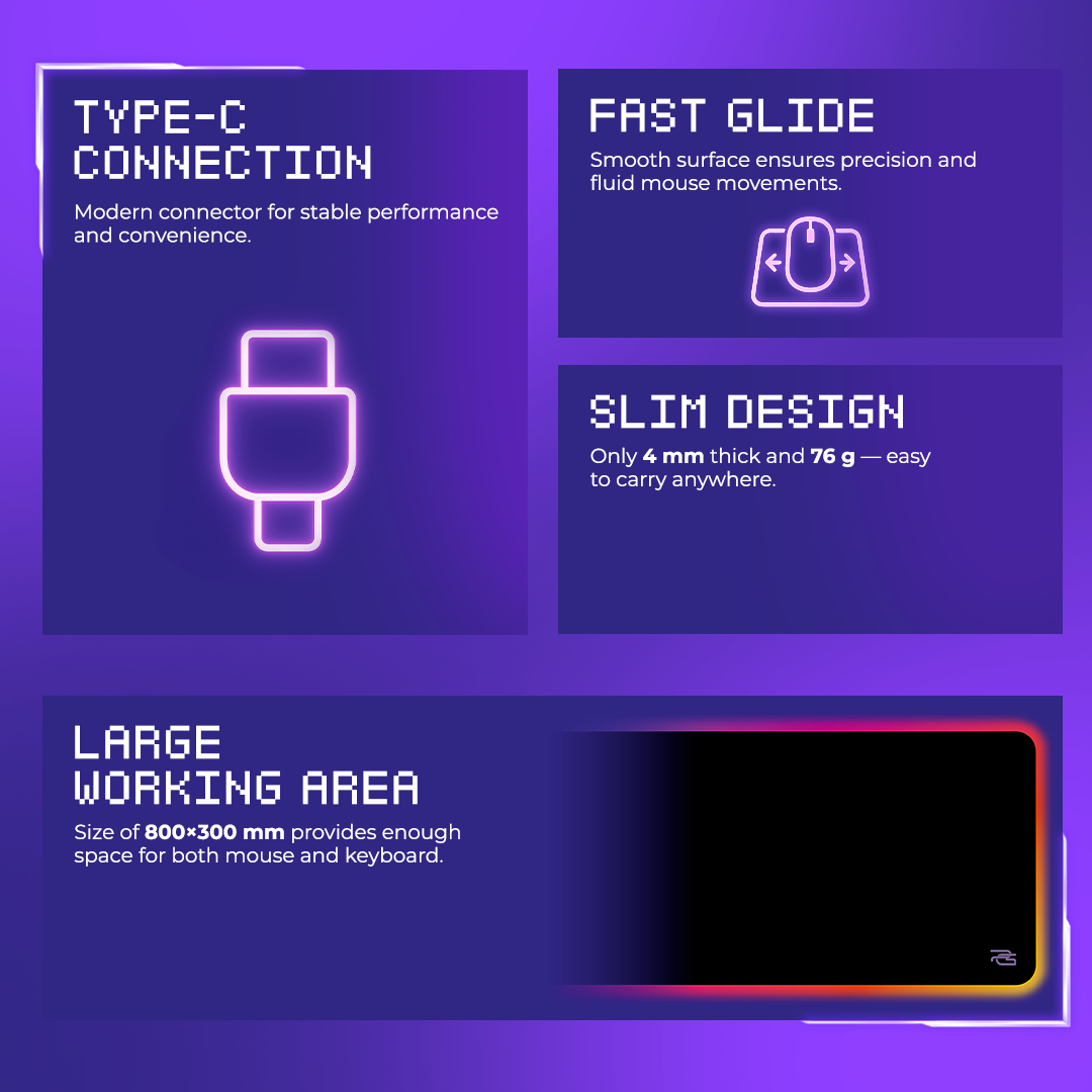 One of the key features of the mouse pad is the presence of 15 RGB effects that can be customised to create a unique atmosphere while gaming. These effects are easily controlled via the USB to Type-C connector, which also provides power from the source. Additionally, the mat has a cable length of 1.8 metres, which provides ample flexibility in placement without restrictions.