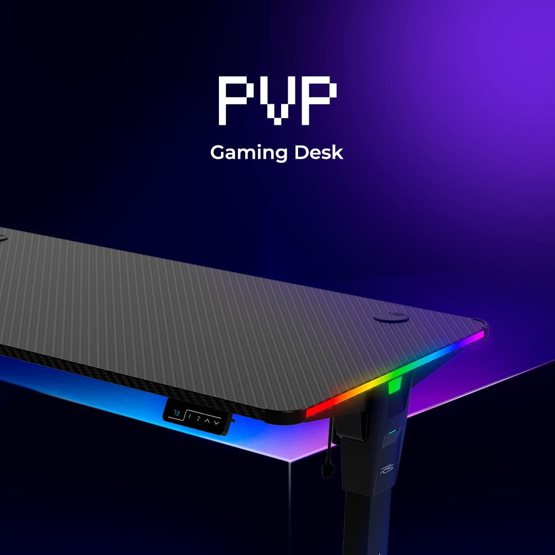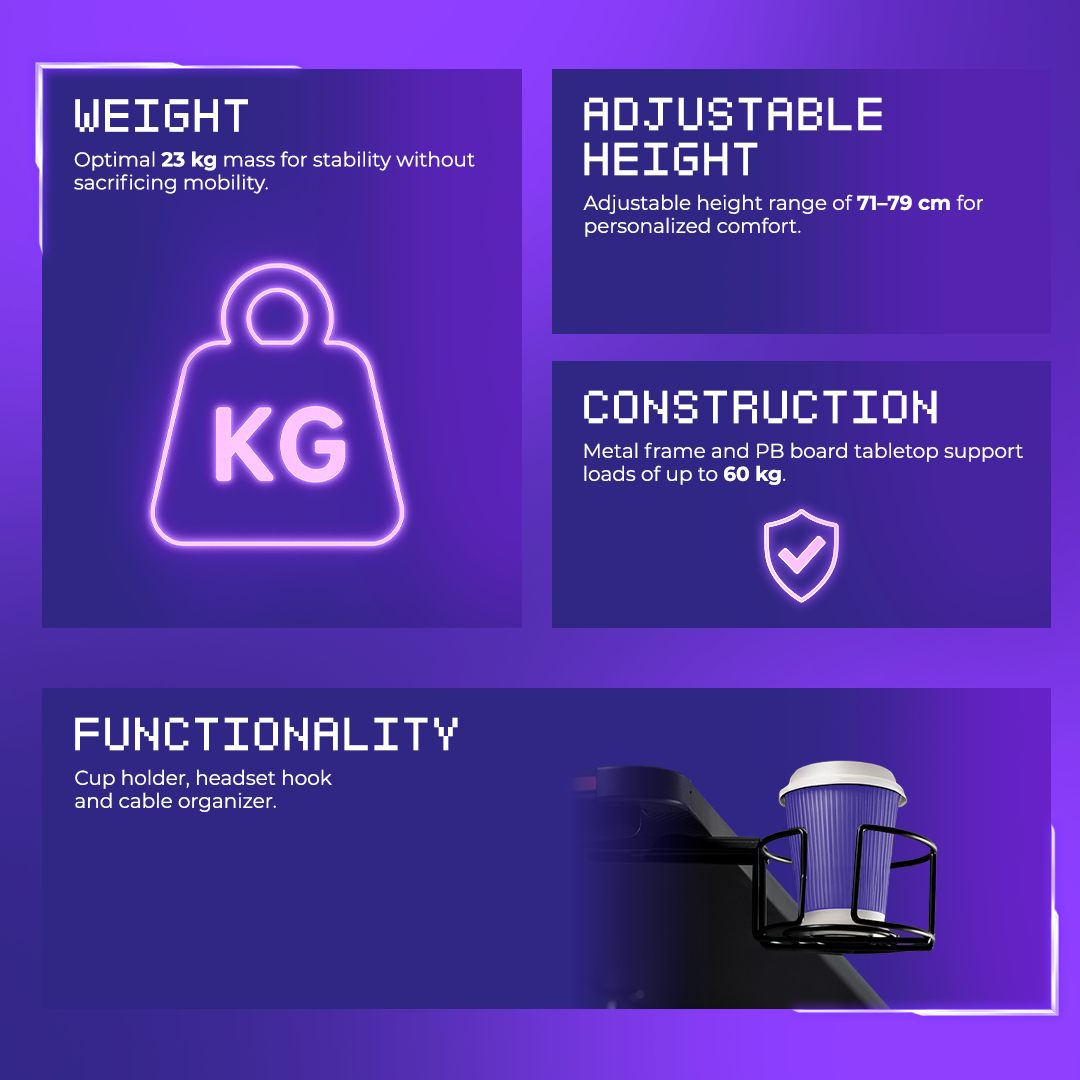A strong steel frame ensures the desk’s stability and durability. The 18 mm thick carbon-fiber coated tabletop is resistant to scratches and wear. The structure is designed to support a maximum load of up to 60 kg — enough for a complete gaming setup.