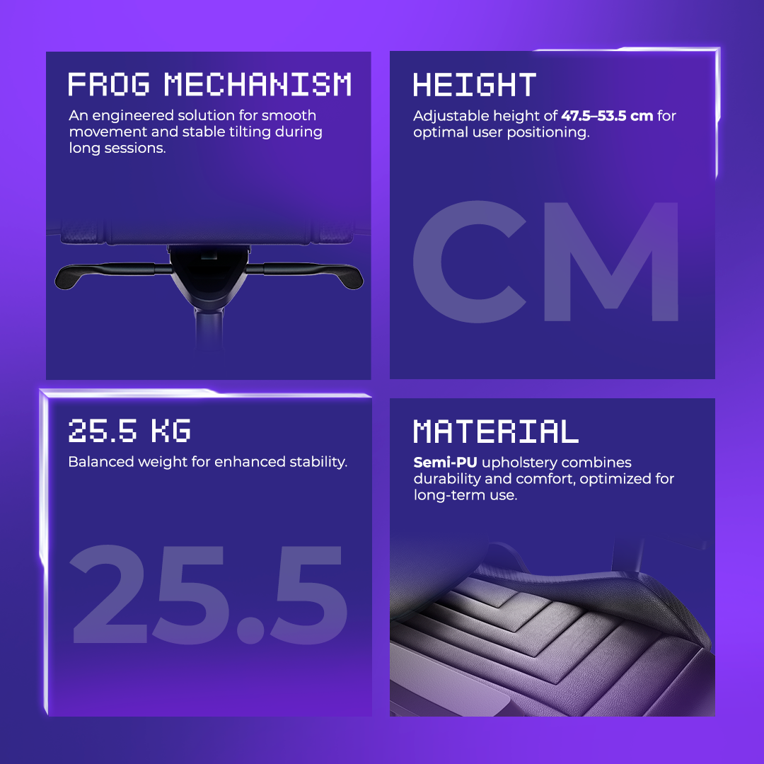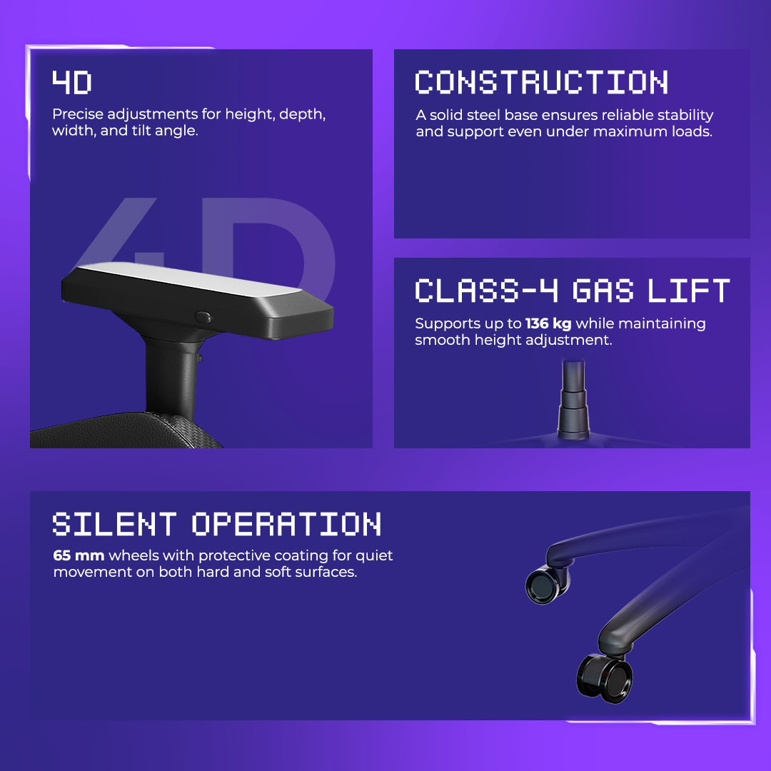 Динамічний дизайн із практичними елементами, як-то бічна підтримка, оптимальний вигин спинки та зручні підлокітники. Ідеальне поєднання комфорту та ергономіки, що налаштовує на продуктивну гру.