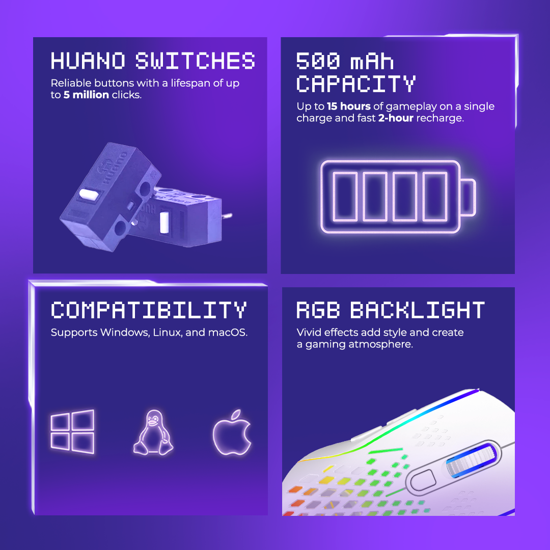 This mouse features a stylish body made of high-strength ABS plastic for both aesthetic appeal and durability. The ergonomic shape with Huano's optimised six buttons ensures comfort for long periods of use, making it the perfect choice for gamers and professionals alike.