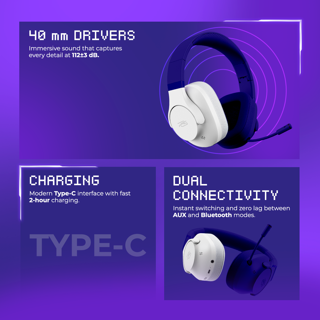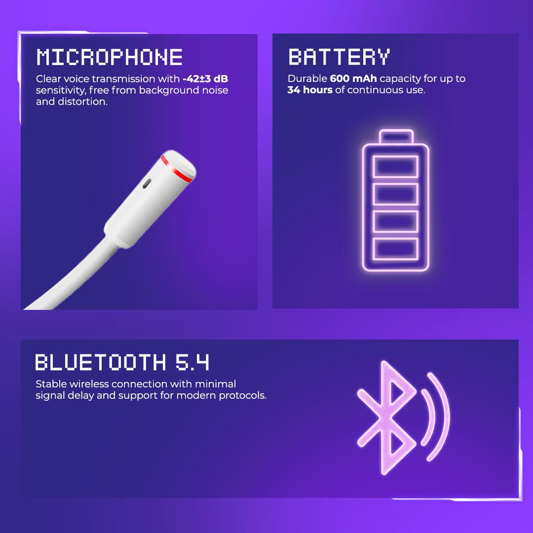 The Bliss headphones offer an exceptional symbiosis of quality sound and stable connectivity. Thanks to Bluetooth 5.4 version and powerful drivers, the headphones deliver excellent frequency response during playback. Great bass, high detail, and vivid music coloration will reveal the accessory's gaming qualities in a new way.