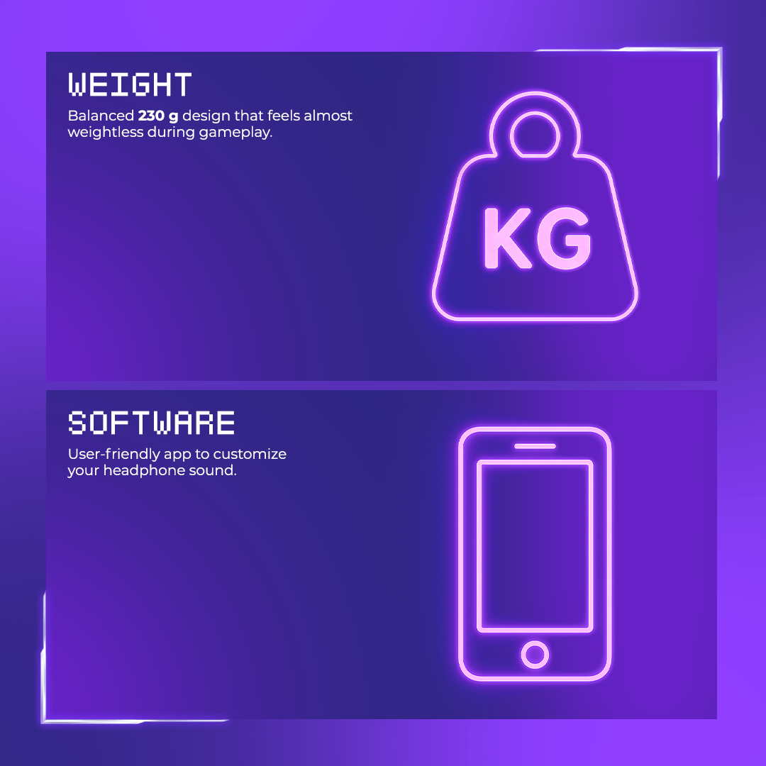 The Bliss headphones are modern and comfortable. Create an incredible atmosphere around you and your gaming setup by immersing yourself in every touch of the gaming universe. Adjust the volume directly on the headphones, use the built-in foldable microphone that won't get in your way during intense gaming, and enjoy an unforgettable experience with Bliss.