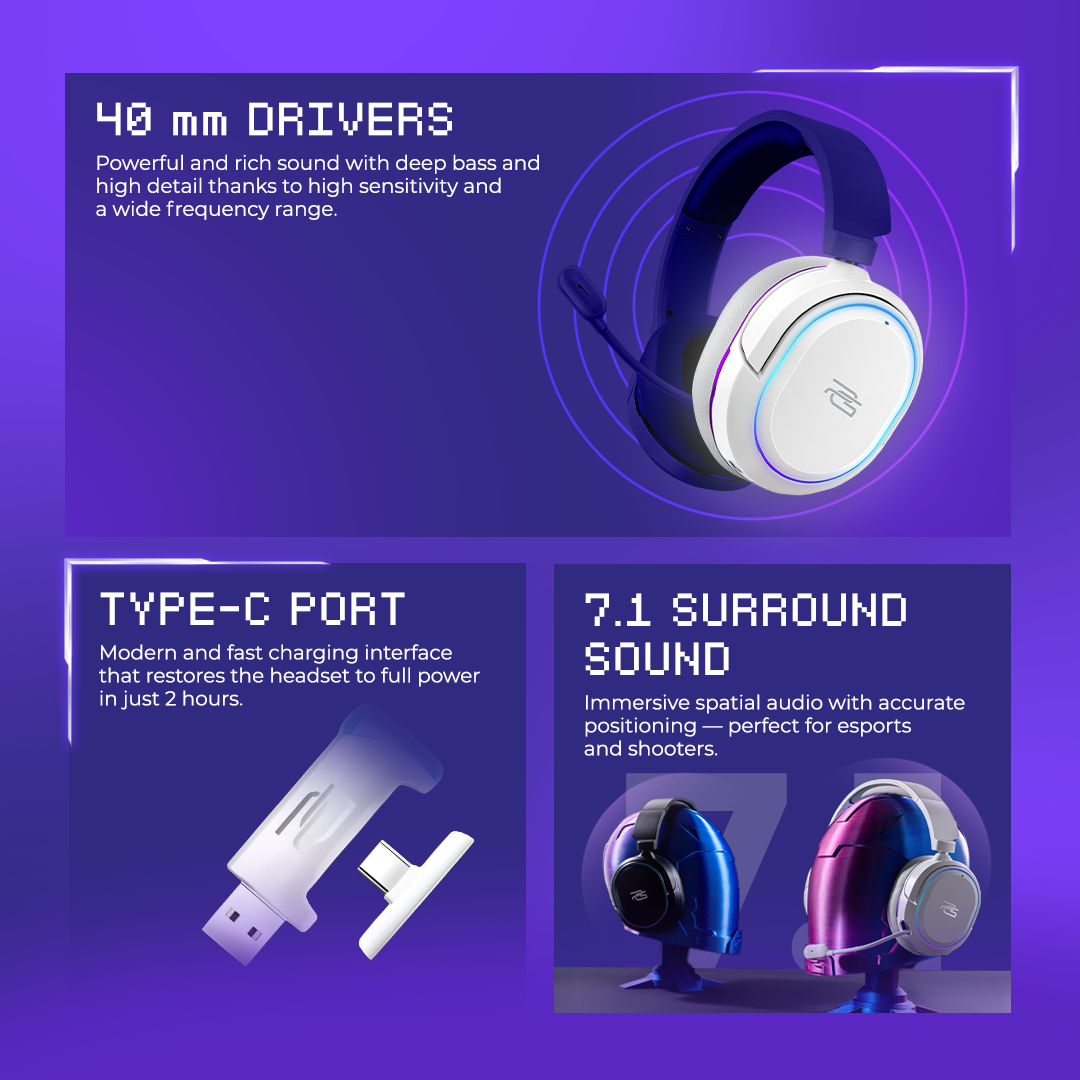 The Proove Gaming Rapture headphones are an exceptional symbiosis of quality sound and stable connectivity. Thanks to Bluetooth 5.3 version or 2.4GHz wireless connection and powerful drivers, the headphones deliver excellent frequency response during playback. Great bass, high detail, and vivid music coloration will reveal the accessory's gaming qualities in a new way.