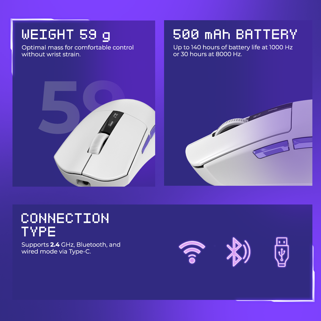 With a polling rate of up to 8000 Hz (wired and wireless), a sensitivity of up to 26000 DPI, and 50G acceleration, the mouse responds instantly to every movement. The built-in OLED display allows you to see DPI, charge and connection type in real time. Three connection options (2.4 GHz, Bluetooth, USB) make Jester versatile for any situation, and the 500 mAh battery lasts up to 140 hours at 1000 Hz or up to 30 hours at 8000 Hz.