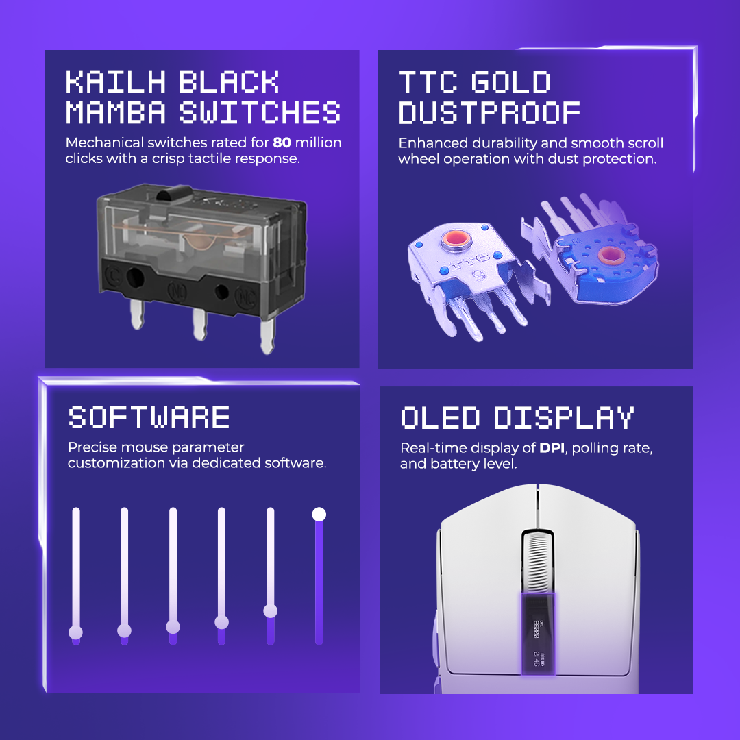 The mouse is made of durable ABS plastic, and inside it is a top-notch set of components: Kailh Black Mamba switches with a lifespan of 80 million clicks, TTC Gold Dustproof encoder and PAW3395 sensor - all for stable, long-lasting performance and absolute control.