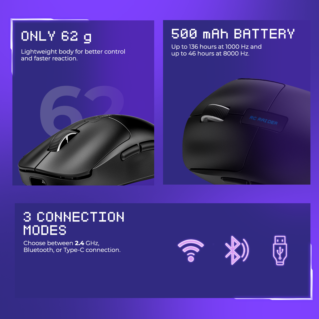The PAW3950 sensor supports up to 32,000 DPI sensitivity and 50G acceleration. It offers a polling rate of 8000 Hz in wireless mode (up to 46 hours of battery life) and 1000 Hz for power saving (up to 136 hours). In wired mode, it operates at 1000 Hz.The mouse also features Hot Swap support — allowing quick switch replacement without a screwdriver. Compatible with all modern platforms and supports 3 connection types: 2.4 GHz, Bluetooth, and USB.