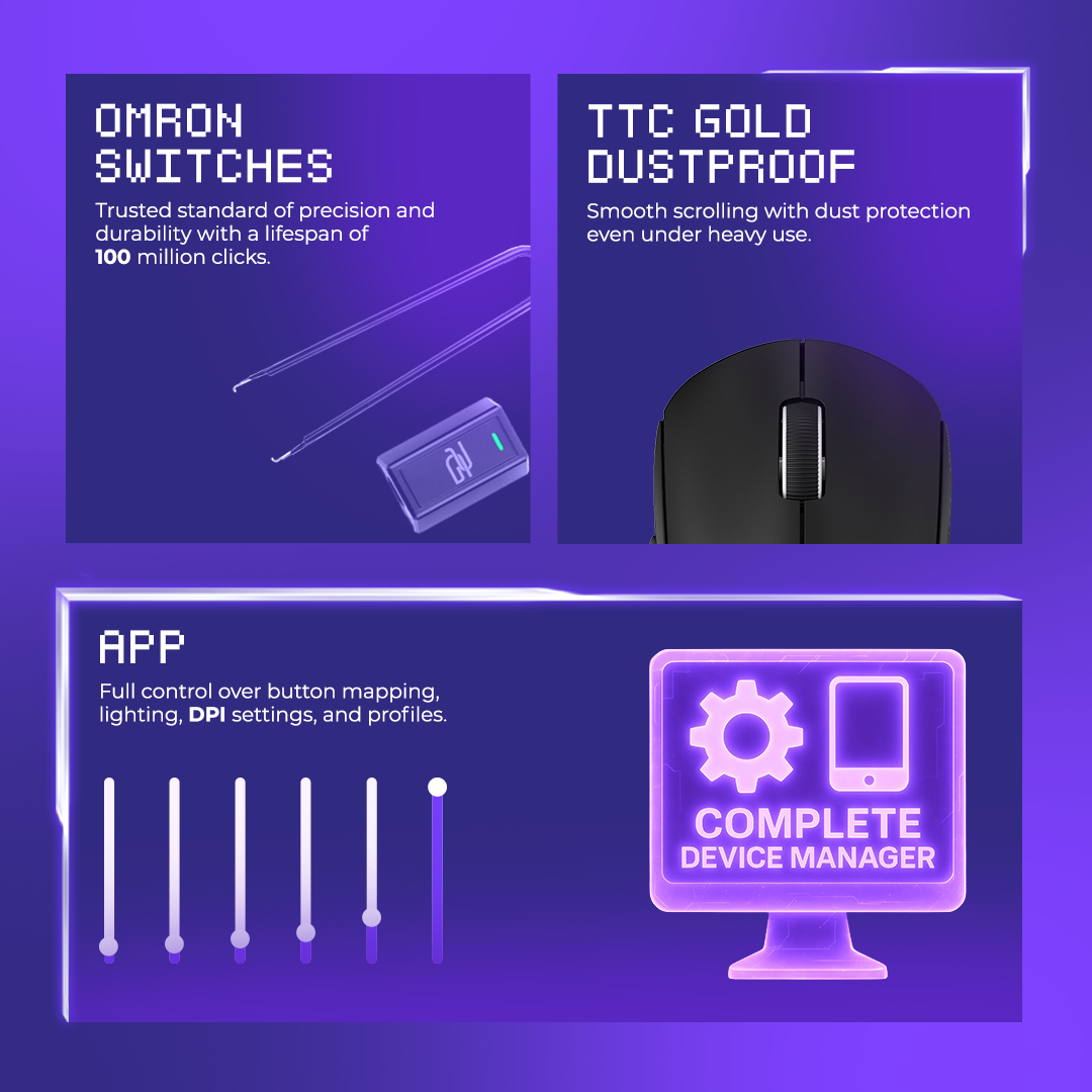The durable ABS plastic body is complemented by PTFE glides for the smoothest possible movement. Omron switches have a lifespan of 100 million clicks, and the TTC Gold Dustproof encoder ensures precise scrolling even under load.